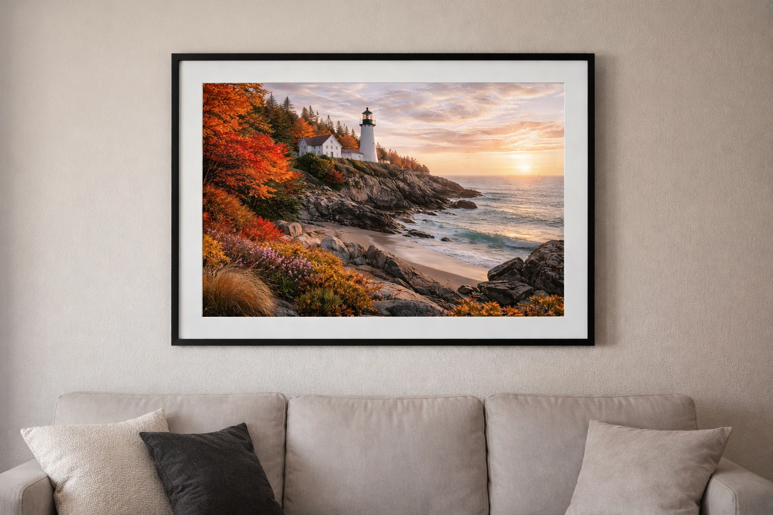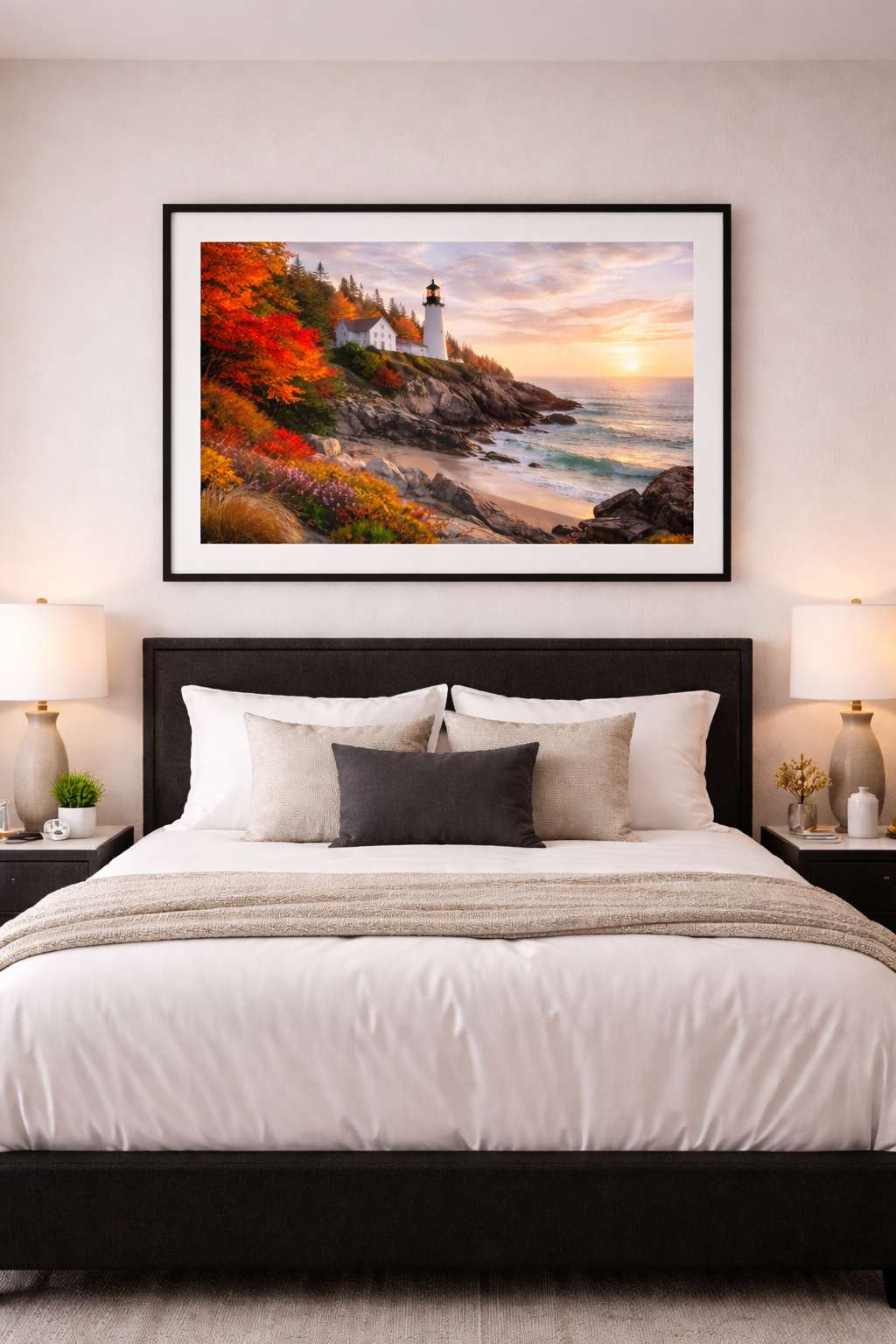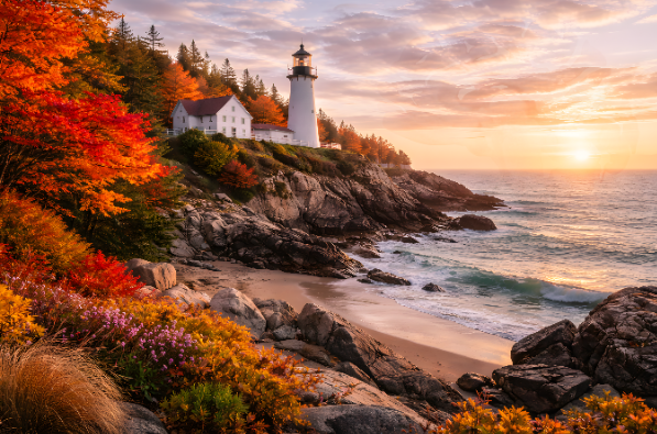 This East Coast lighthouse scene captures a warm autumn sunset spilling across rugged shoreline, glowing trees, and soft ocean waves. At first glance, it’s a peaceful, classic seaside landscape. But look closer, woven subtly into the scene is a hidden form of the human brain, blending art, nature, and anatomy into a single, captivating piece.